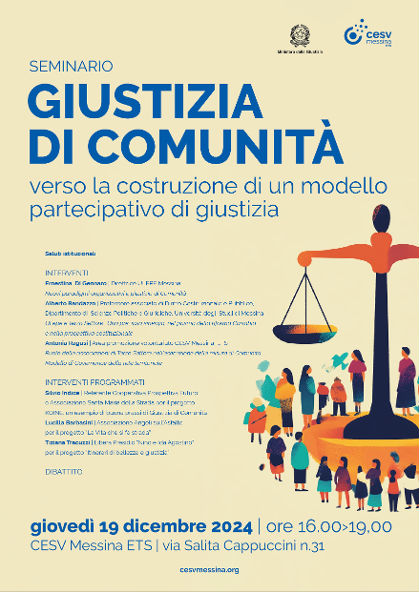 Approfondimento, scambio di esperienze, promozione e diffusione dell’accoglienza da parte degli ETS di persone sottoposte a misure penali non detentive sono al centro del seminario “Giustizia di comu-nità: verso la costruzione di un modello partecipativo di giustizia” che si terrà giovedì 19 dicembre dalle ore 16:00 alle ore 19:00 nella sede del CESV, via Salita Cappuccini 31.